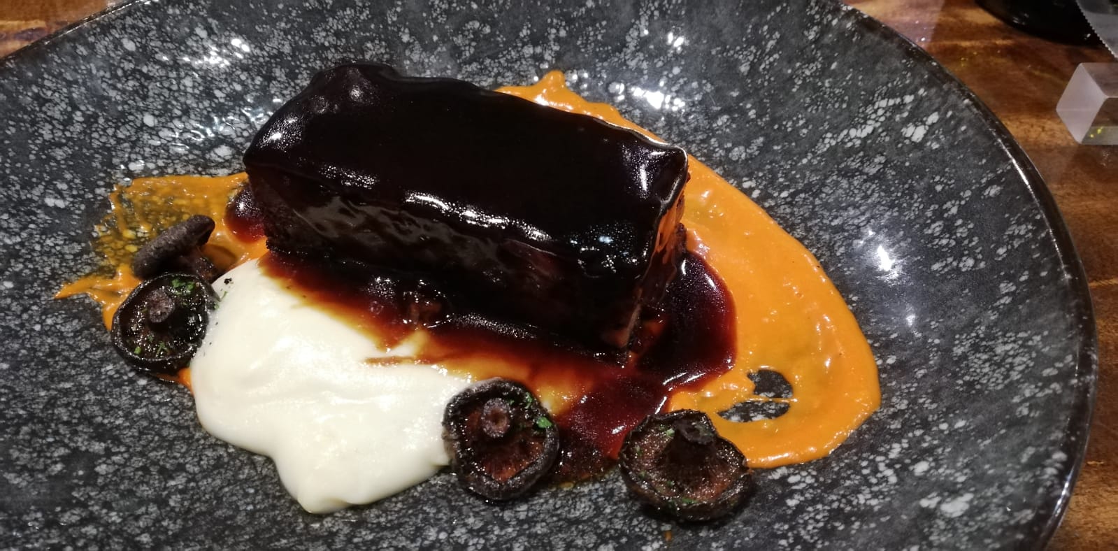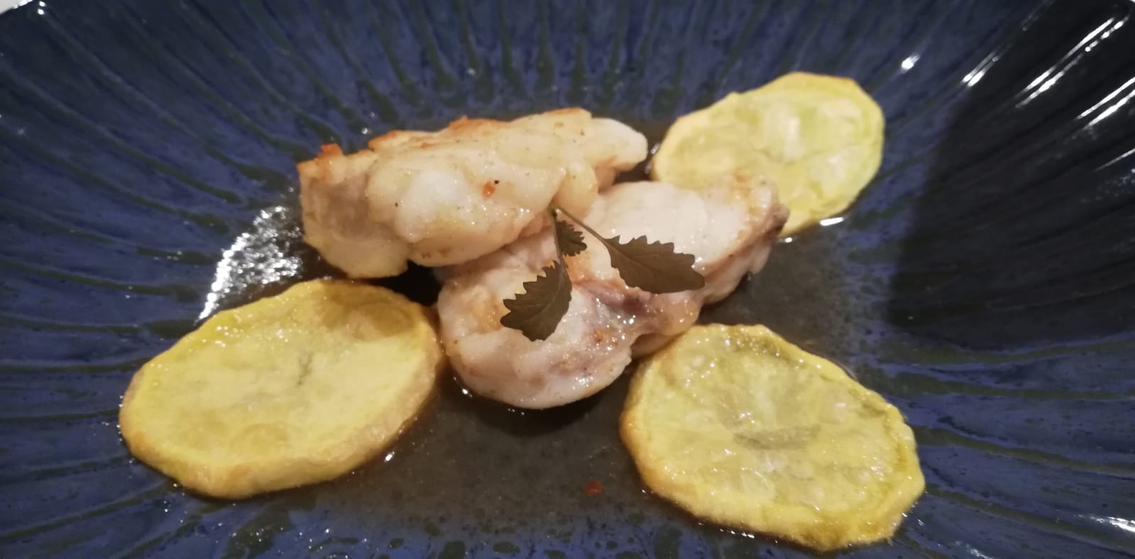 Oreja de cerdo en dos texturas con una salsa de soja y mielLomos de bacalao al “pilpil”