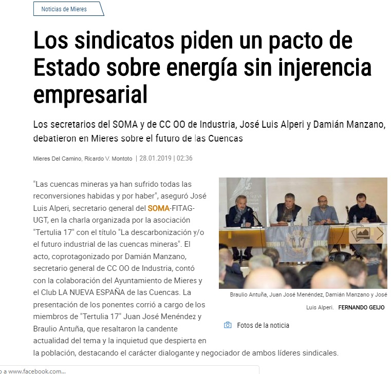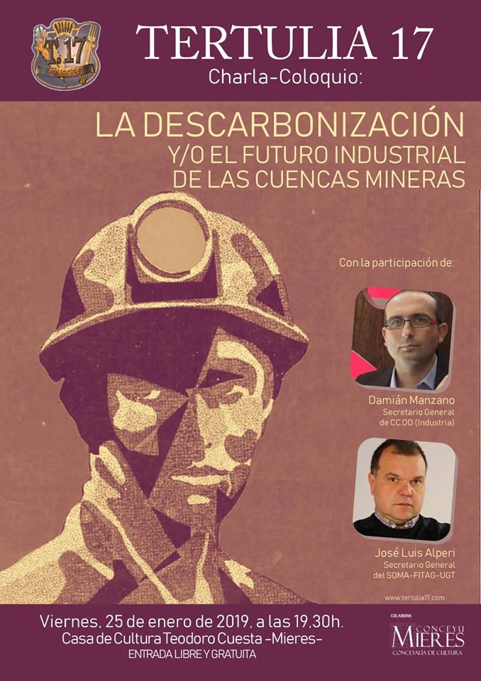 El pasado viernes día 25 de enero Tertulia 17 de Mieres unió en la casa de la Cultura de Mieres a los secretarios Generales de Asturias de los sindicatos CC.OO. de la Federación de Industria y Secretario general de SOMA-FITAG-UGT. Damián Manzano y José Luis Alperi, respectivamente.
